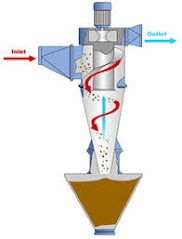 The suspension of a solid in gas (usually air) is introduced tangentially at a very high velocity, so that rotary movement takes place within the vessel. The fluid is removed from a central outlet at the top. The rotatory flow within the cyclone separator causes the particles to be acted on by centrifugal force. The solids are thrown out to the walls, thereafter it falls to the conical base and discharged out through solids outlet.