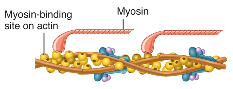 With the exposure of the myosin binding sites on actin (the thin filaments)—in the presence of Ca2+ and ATP—the thick and thin filaments “slide” on one another and the sarcomere is shortened