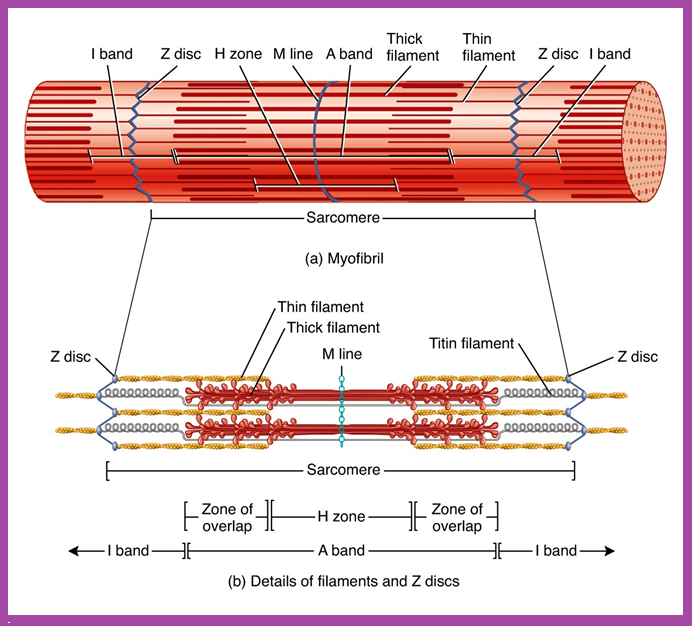 Each myosin molecule has a tail region and 2 globular heads (crossbridges)