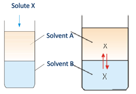 they form separate layers. When a solute X which is soluble in both solvents is added, it gets distributed or partitioned between them. Molecules of X pass from solvent A to B and from solvent B to A. Finally a dynamic equilibrium is set up. At equilibrium, the rate, at which molecules of X pass from one solvent to the other is balanced